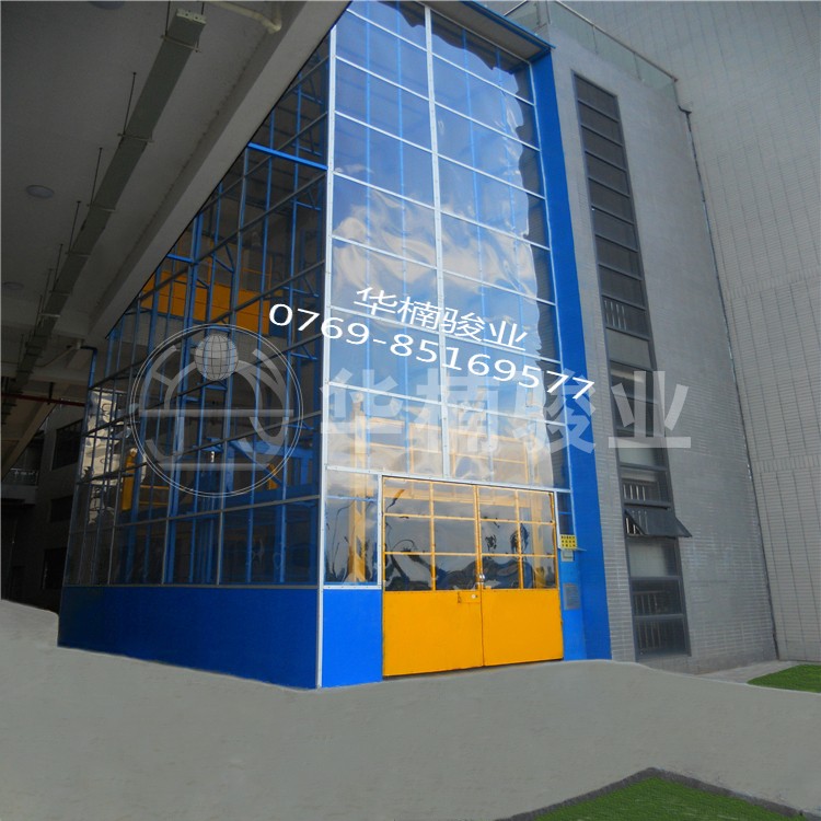 升降機室外安裝,一面靠外墻,另三面用鋼構做主體框架,外圍噴彩藍色油漆,用透明PC